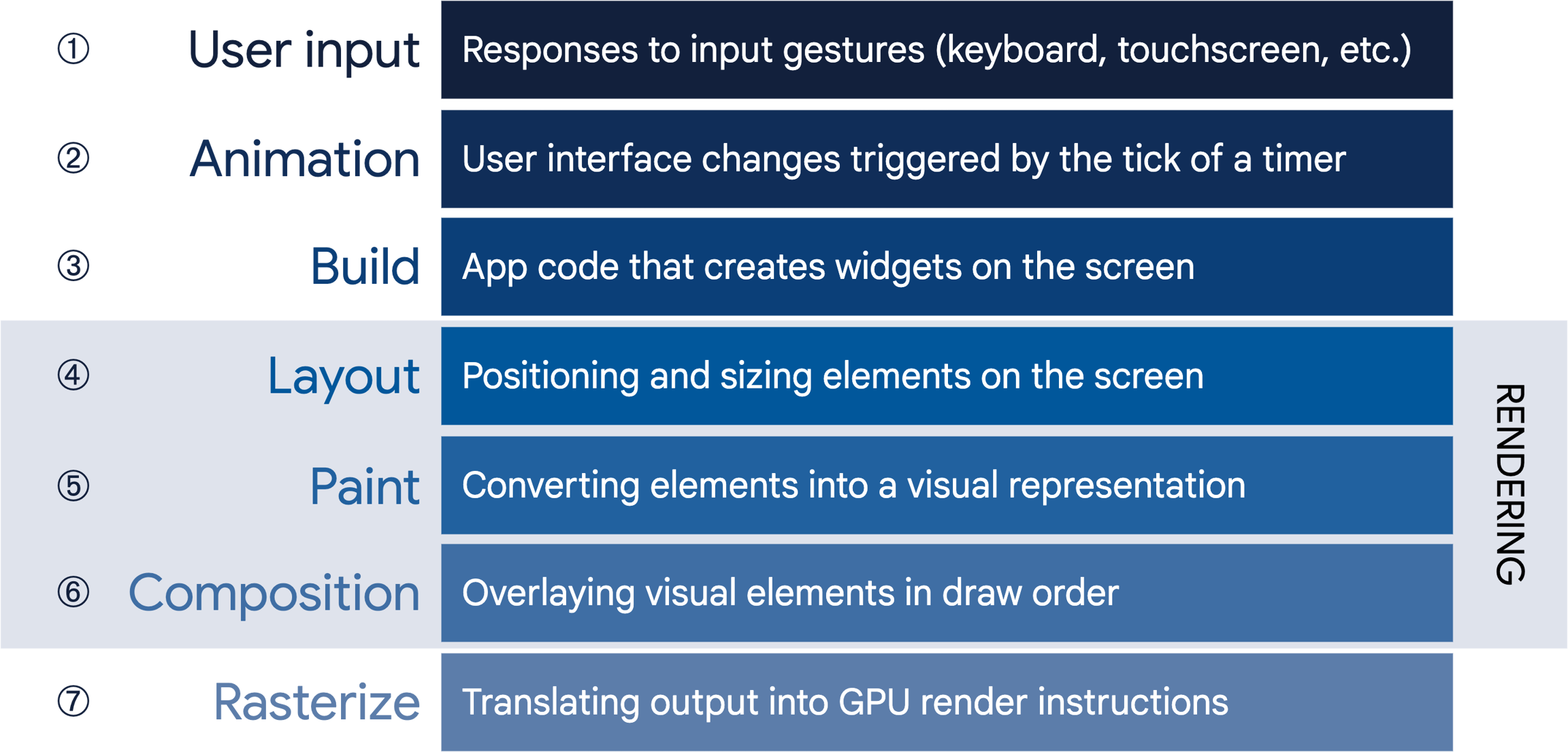 Flutter transforms widgets into actual visuals on your screen through several steps. This process is called the rendering pipeline: